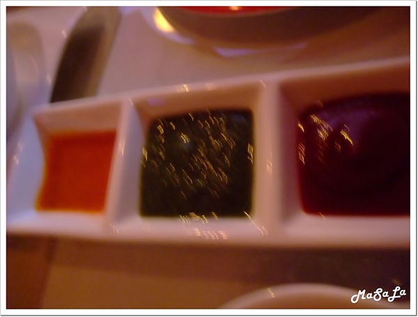 餓到昏了,手也抖了...三種沾醬,我只知道右邊那個是蕃茄醬....